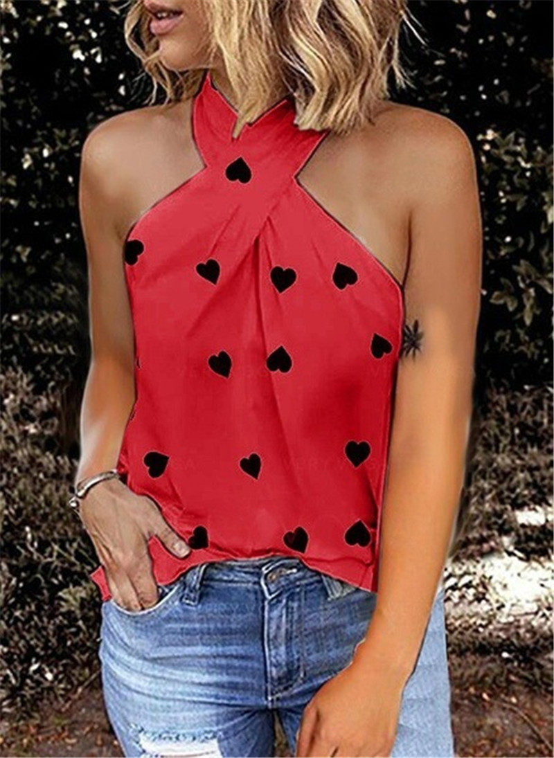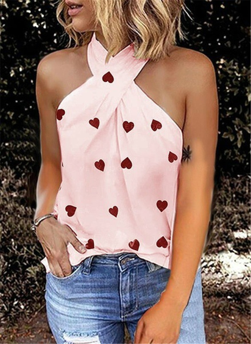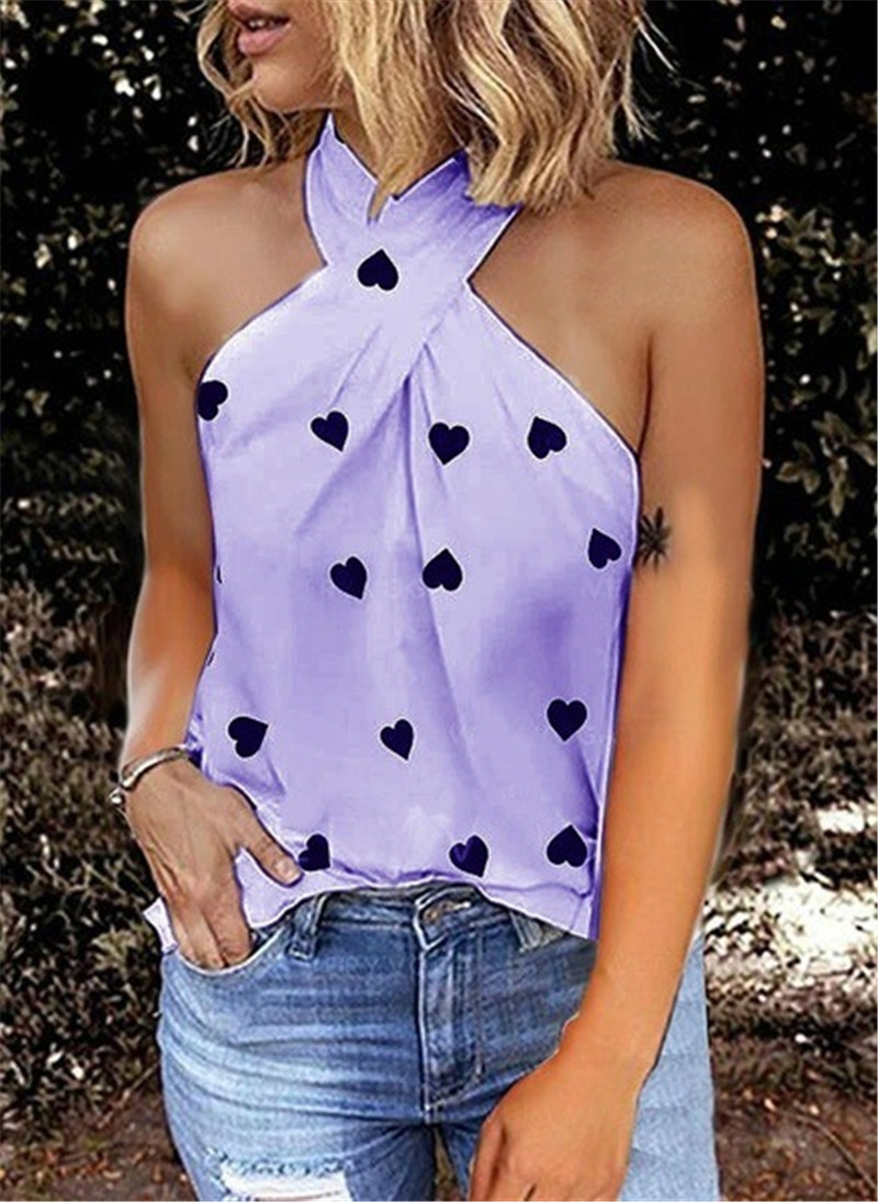 Casual Slim Back Zipper Halter Print Sleeveless Splicing Top