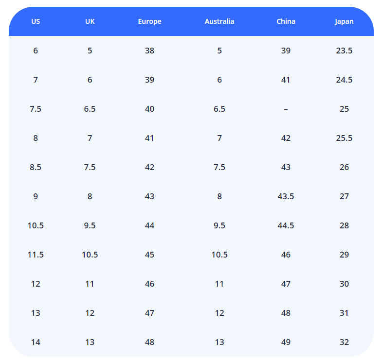 Sizes: 38, 39, 40, 41, 42, 43, 44, 45, 46, 47, 48