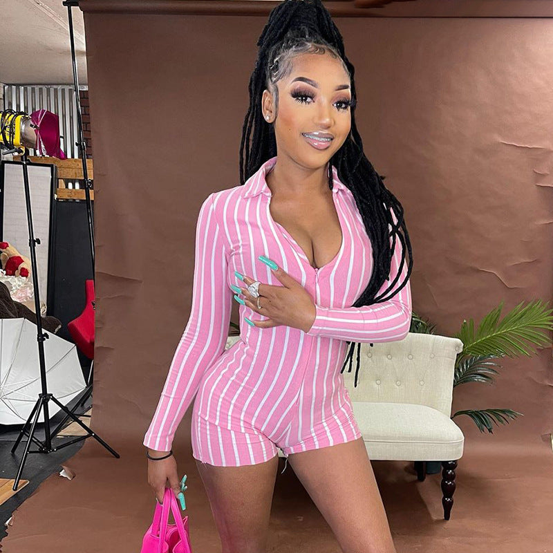 Lapel Zipper Slim Vertical Stripes Women's One-piece Shorts