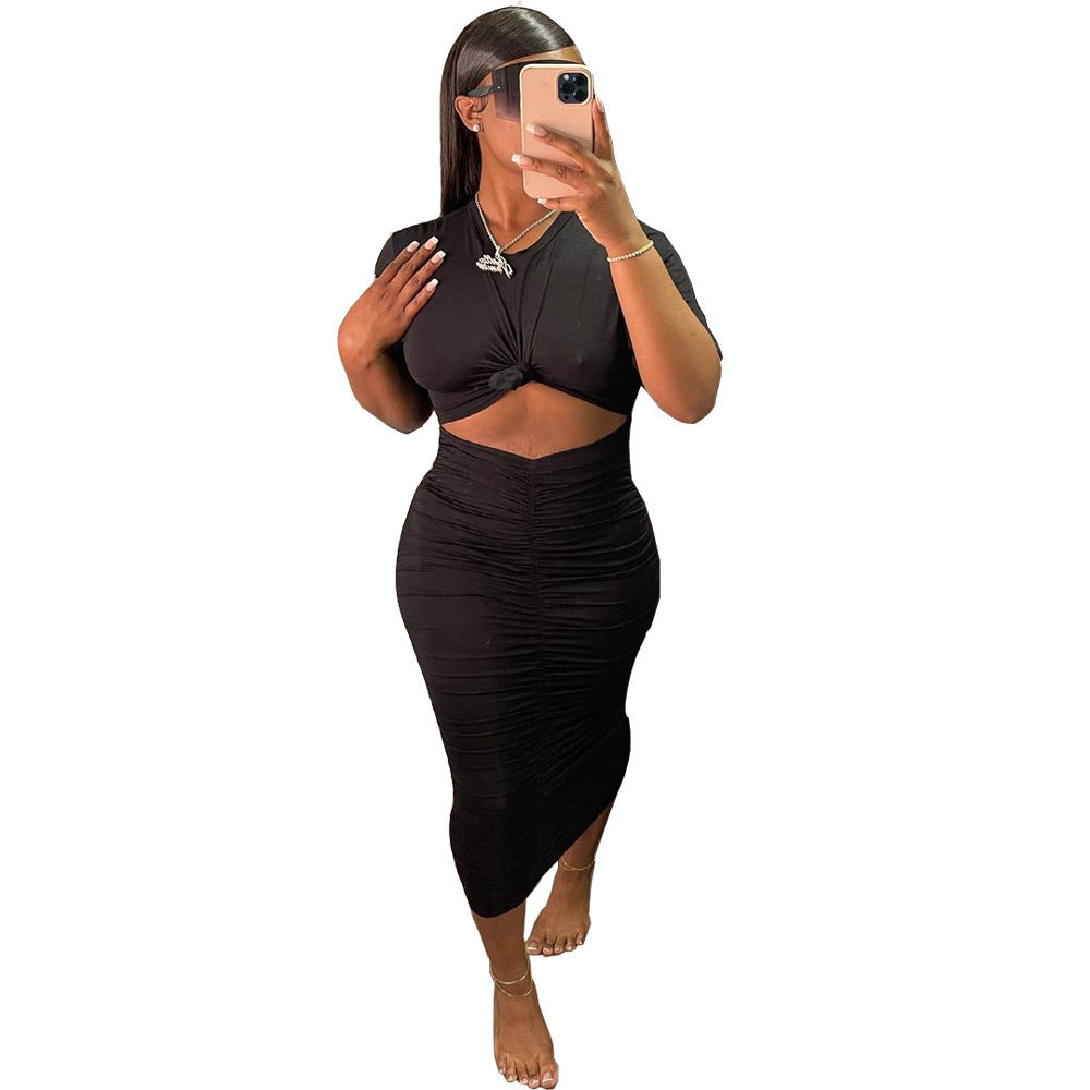 Fashion Solid Color Pleating Short Sleeve Dress Suit