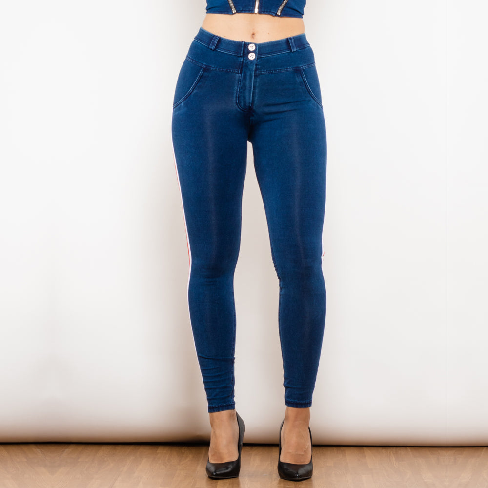 Shascullfites Melody White&Red Side Stripe Dark Blue Denim Jeans Middle Waist Stretch Pants Slim Straight Butt Lift Pants