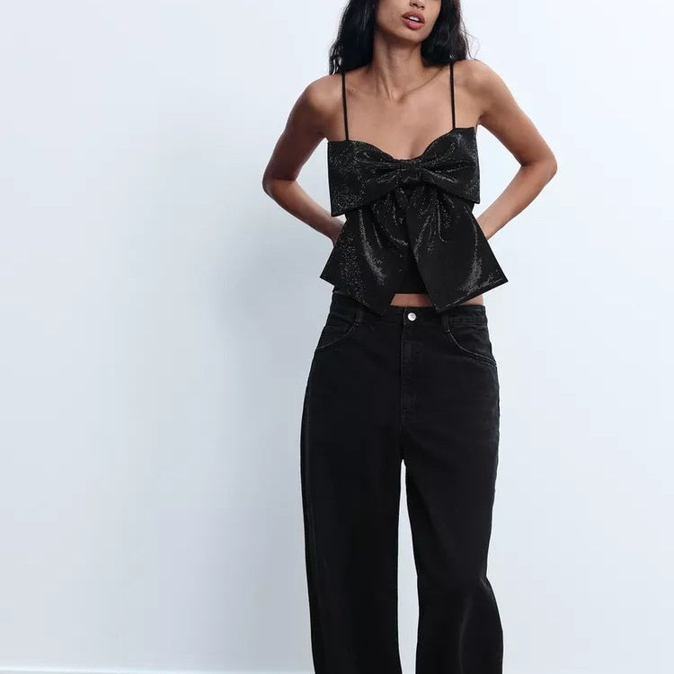 Sleeveless Rhinestone Bowknot Decoration Short Strap Top