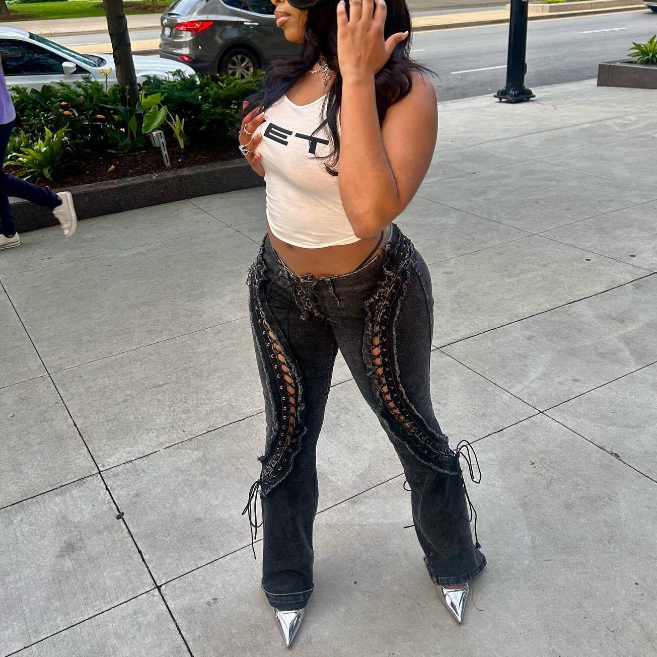 Stretch All-matching Frayed Lace-up New Slim Jeans For Women