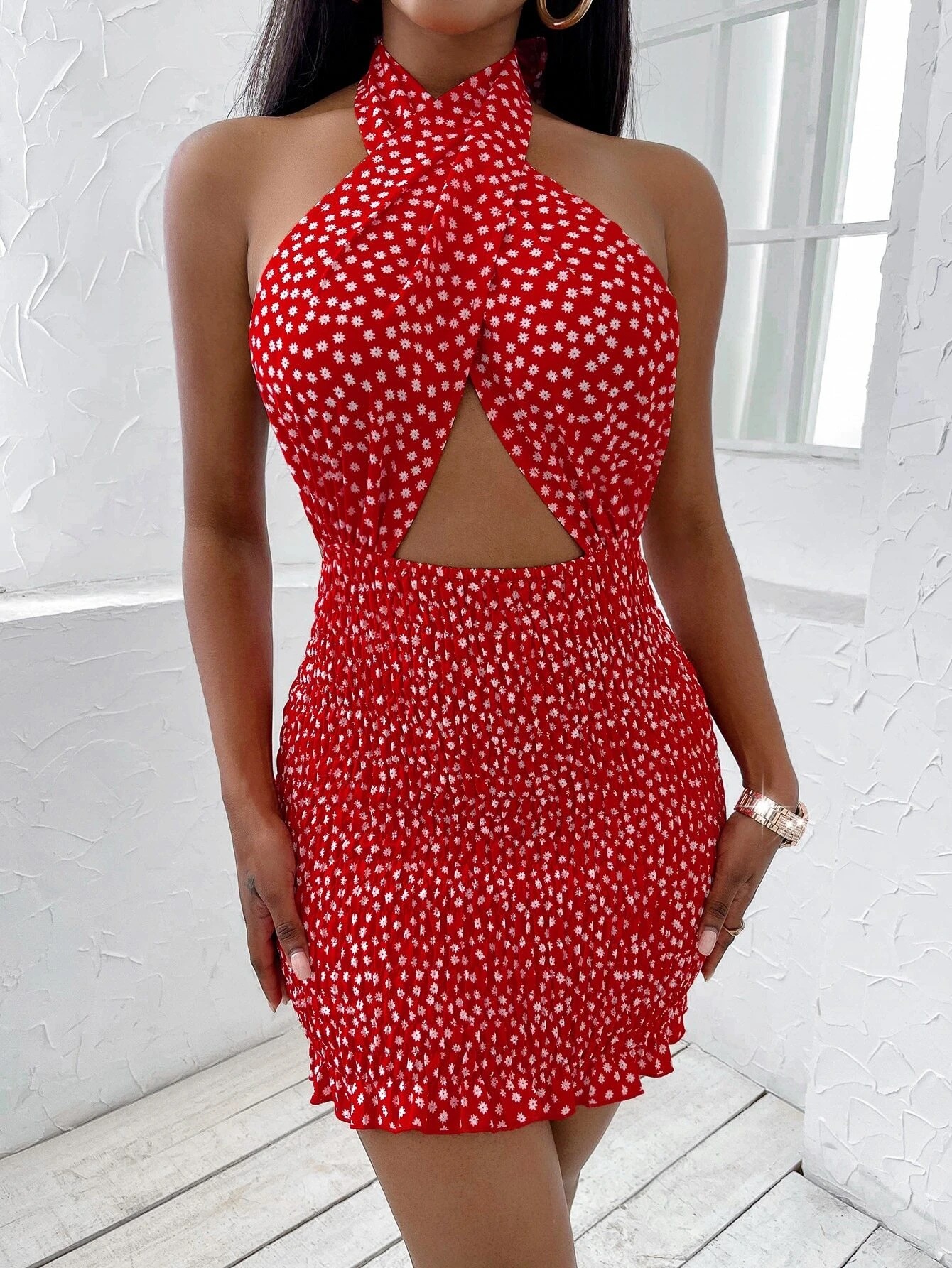 Summer New Sexy Wispy Empty Backless Halter Neck Dress Slim Bag Buttocks Ruffle Skirt Women