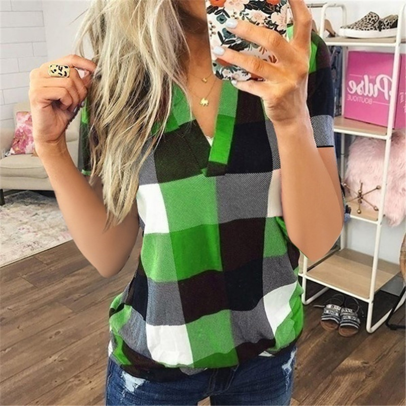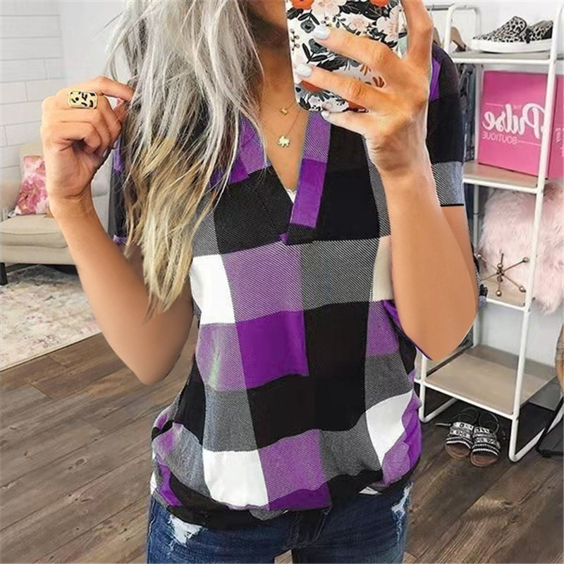 Women's New Shirt Plaid Printed V-Neck Short-Sleeved Shirt T-Shirt Women